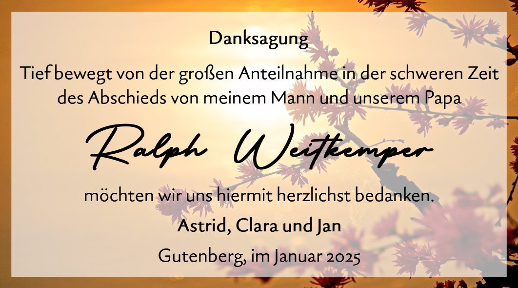 Möge diese Gedenkseite Ihnen Trost spenden und Raum bieten, wertvolle Erinnerungen zu teilen, um das Andenken an Ihren lieben Verstorbenen gemeinsam lebendig zu halten.