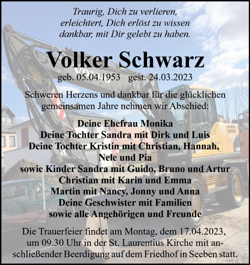 Mein allerherzlichstes Beileid den Angehörigen meines Freundes Volker Schwarz. Hab nur durch Zufall auf dem Friedhof in Seeben sein Grab durch die davor stehende, beschriftete Kerze Volker zuordnen können. Es war wie ein Schock, und ich bin betroffen und traurig. Er war ja noch 5 Jahre jünger als ich. Sehe ihn noch immer seine Oma und seinen an Kinderlähmung erkrankten Bruder Lothar im Nachbarhaus besuchen. Im Garten seines, von ihm selbst erbauten Hauses in Seeben verlebten wir oft schöne Grillabende. Als er in sein zweites, selbst erbautes Haus in Morl einzog, und ich von Seeben nach Gutenberg zog, liefen wir uns nicht mehr so oft über den Weg.